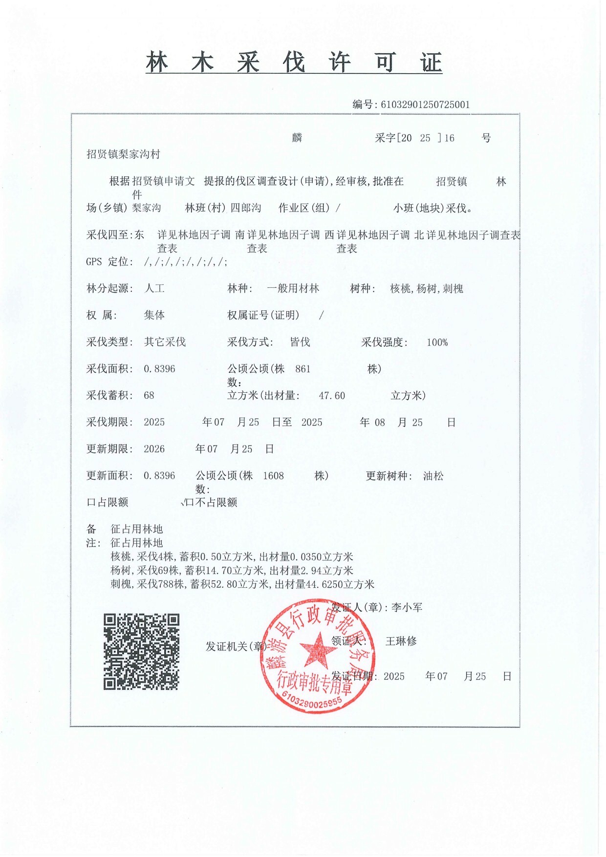 林木采伐许可证61032901250725001