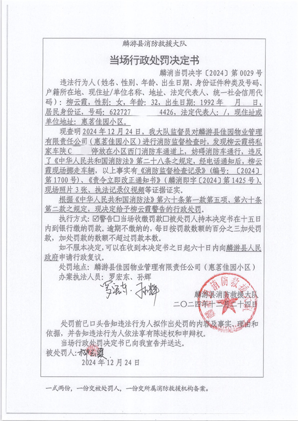 麟游县消防救援大队当场行政处罚决定书(麟消当罚决字〔2024〕第0029号)