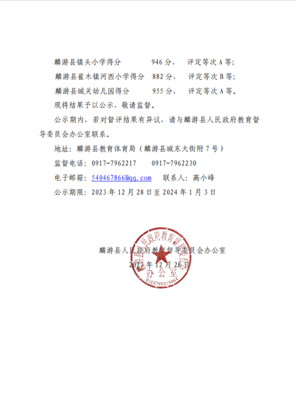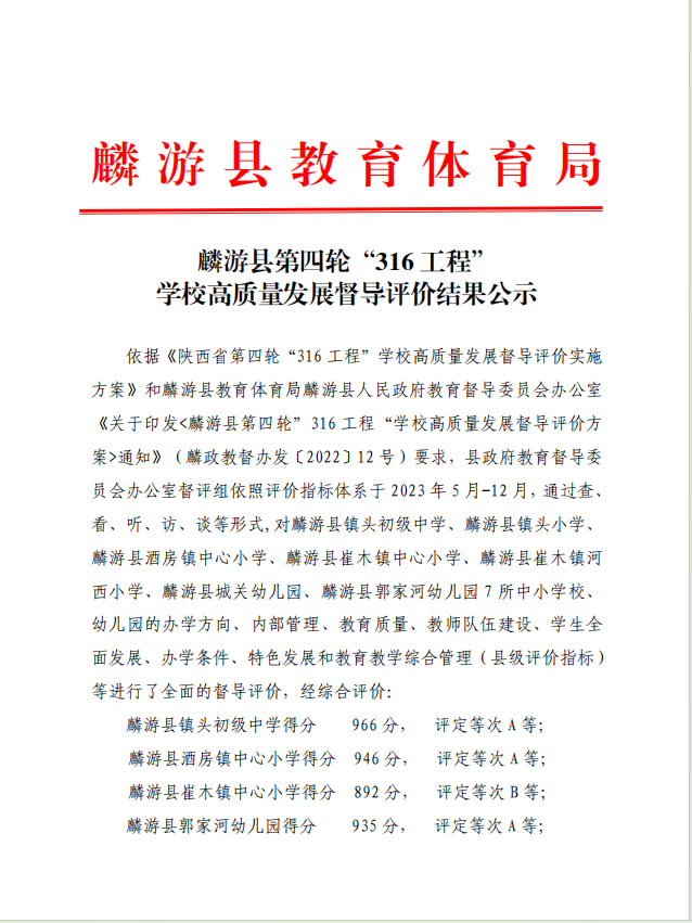 麟游县第四轮“316工程”学校高质量发展督导评价结果公示