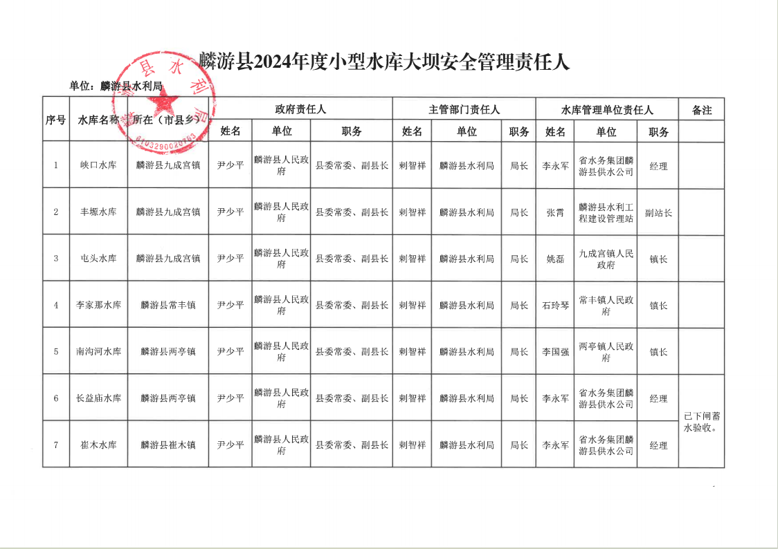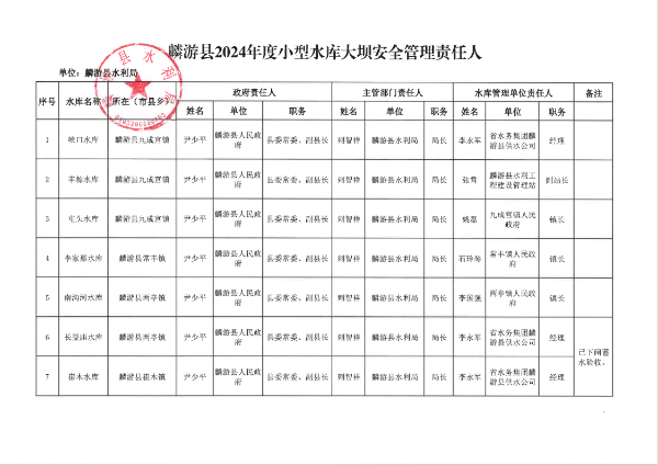 为切实做好麟游县2024年水库防汛安全工作,落实各级责任,根据《中华人民共和国防洪法》和水利部《小型水库防汛“三个责任人”履职手册(试行)》要求,现对我县水库大坝安全责任人名单予以公示,接受社会监督。公示期间如有异议,可向县水利局反映。