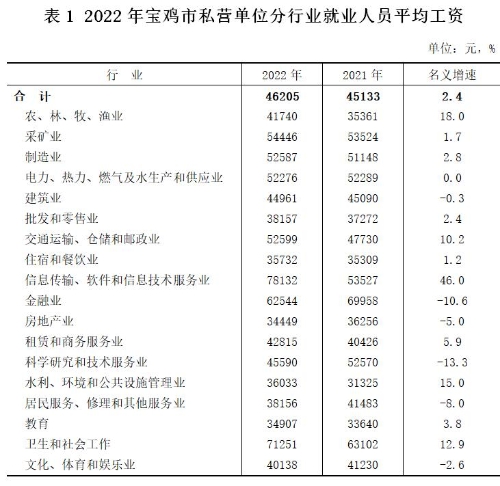 2022年宝鸡市私营单位就业人员年平均工资为46205元,比上年增加1072元,同比名义增长2.4%。扣除物价因素,2022年宝鸡市私营单位就业人员年平均工资实际增长0.5%。