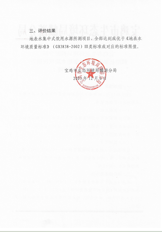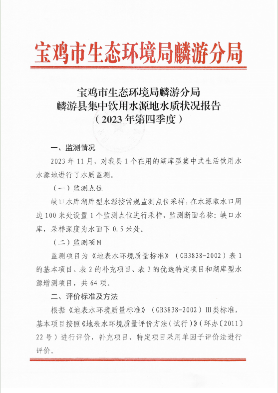 麟游县集中饮用水源地水质状况报告(2023年第四季度)