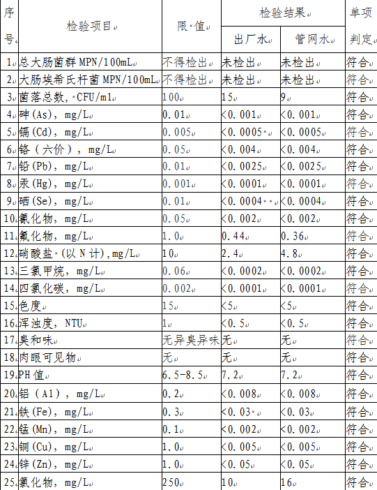 根据《生活饮用水卫生监督管理办法》《生活饮用水卫生规范》及《生活饮用水卫生标准(GB5749-2022)》,现将2023年第四季度水质检测结果予以公示。(检测结果由陕西省水务集团麟游县供水有限公司提供,陕西亿碧圆环境检测有限公司检测,检测报告编号为SYB23-0028S 、SYB23-0030S)。